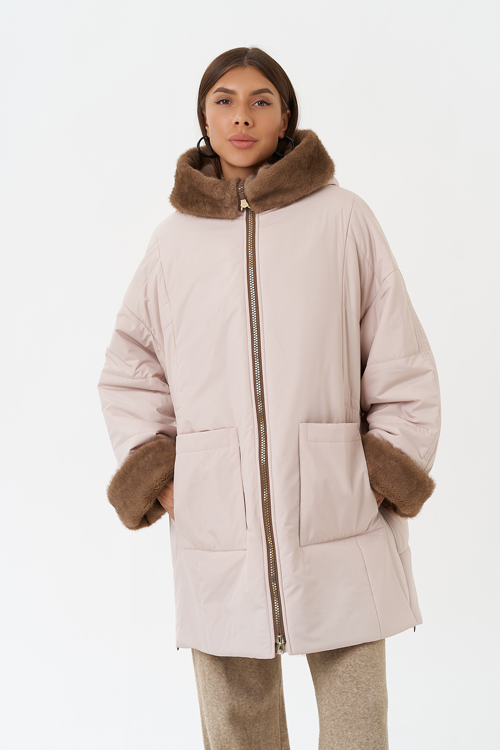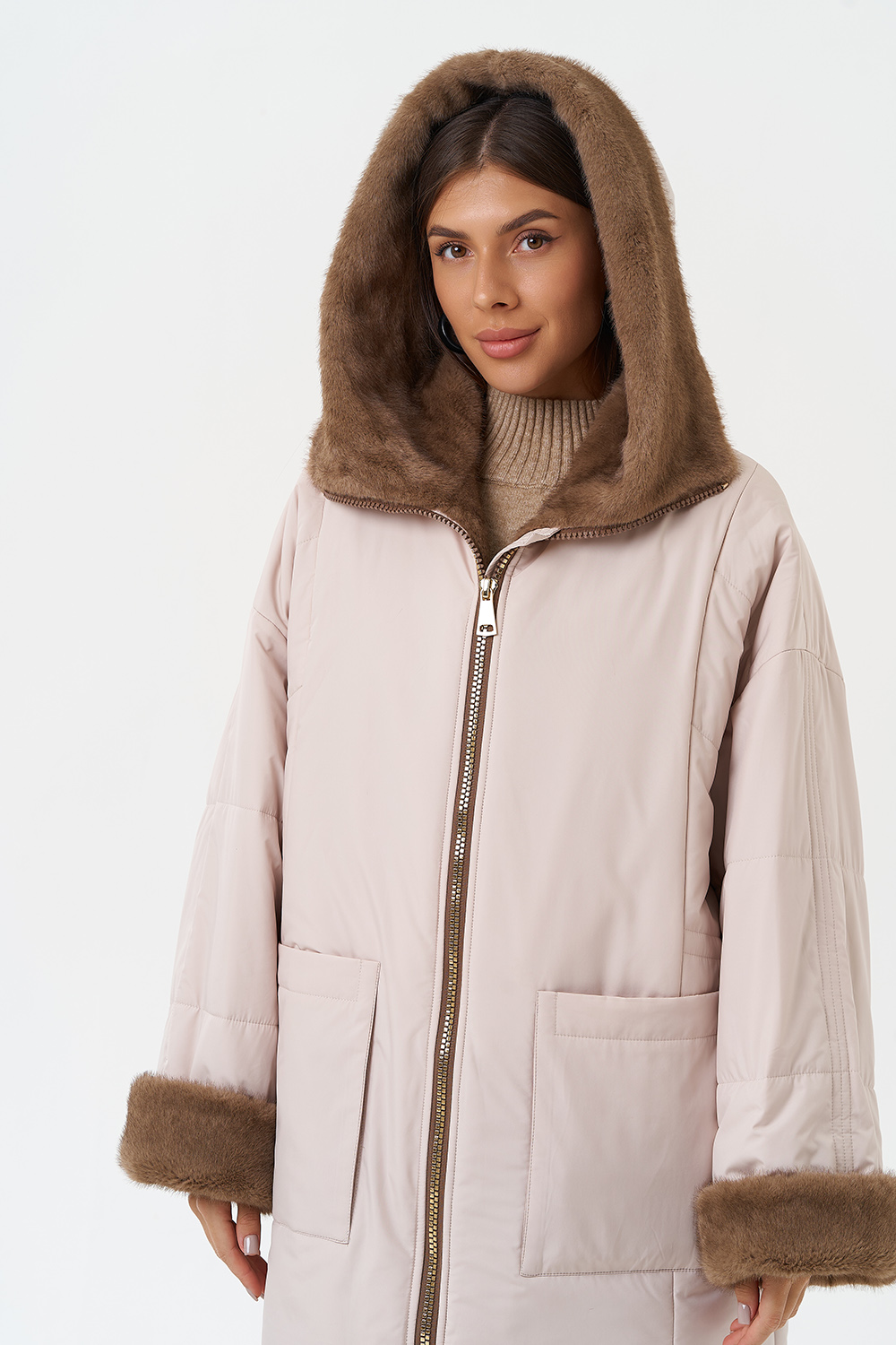Крой воротника - капюшон, отделка эко мех под норку