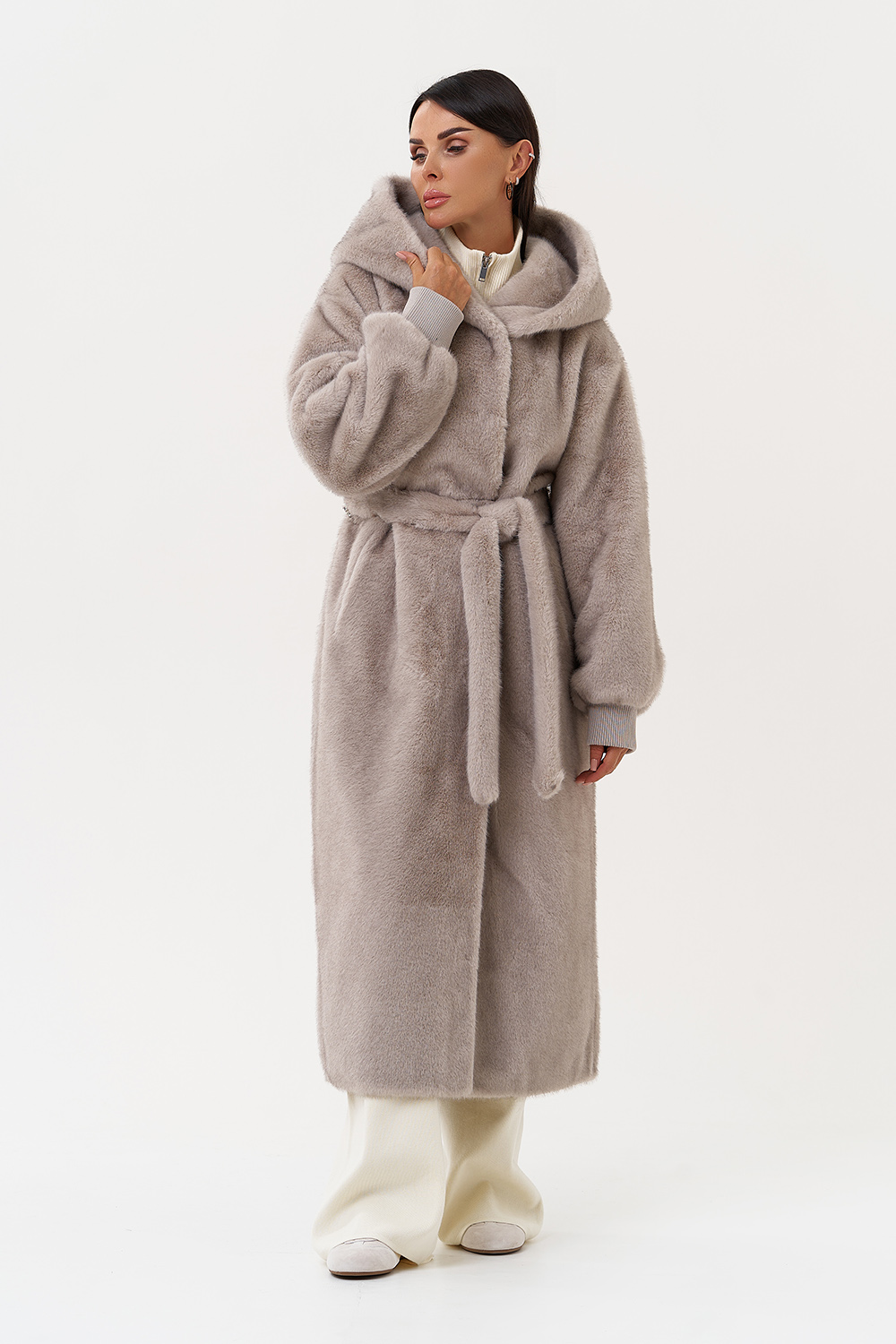 Фасон - прямой Длина изделия - 120 см Цвет - серый Материал - экомех Состав полотна - полиэстер 100% Подкладка - полиэстер 100% Вид застежки - молния, пояс, кулиска на талии Вид ворота - капюшон Фасон рукава - спущенное плечо, длинный |