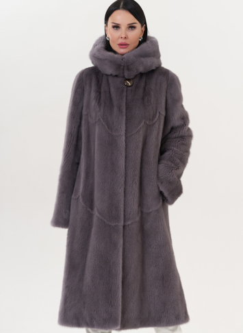 Норковая шуба с капюшоном в фиолетовом цвете.